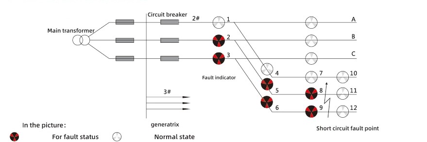 ขึ้นอยู่กับลักษณะของความผิดพลาดของการลัดวงจร เกณฑ์การดำเนินการคือการเปลี่ยนแปลงอย่างกะทันหันของกระแสไฟฟ้าพร้อมกับไฟฟ้าขัดข้องของอุปกรณ์ป้องกัน ตรรกะการตีความของแผนภาพแสดงข้อบกพร่องเป็นดังนี้: หากตัวบ่งชี้ 2, 5 และ 8 ของเฟส A และตัวบ่งชี้ 3, 6 และ 9 ของเฟส C ของบรรทัดที่ 2 ทั้งหมดเปลี่ยนเป็นสีแดง ในขณะที่ตัวบ่งชี้ 11 และ 12 ยังคงเป็นสีขาว ก็สามารถระบุได้ว่าเกิดข้อผิดพลาดในการลัดวงจรที่จุดบรรทัดขาออกนั้น
