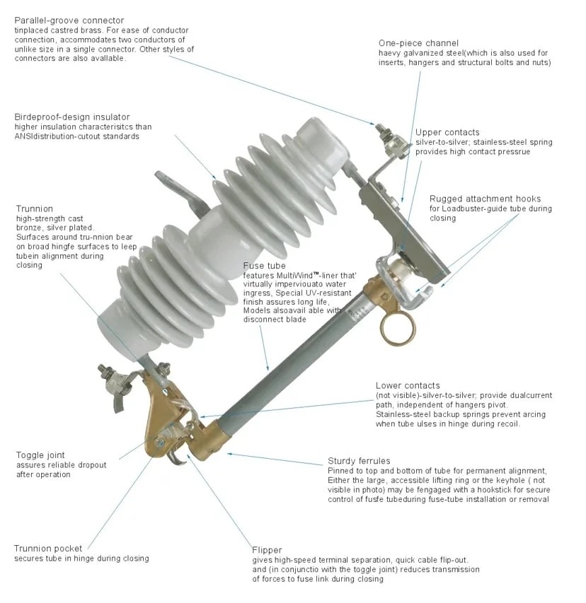 Dropout Fuse CutoutsDropout Cutouts มีคุณสมบัติที่สำคัญ โดยสามารถให้สัญญาณที่มองเห็นได้ ข้อบ่งชี้นี้จะปรากฏขึ้นเมื่อส่วนประกอบฟิวส์ทำงาน