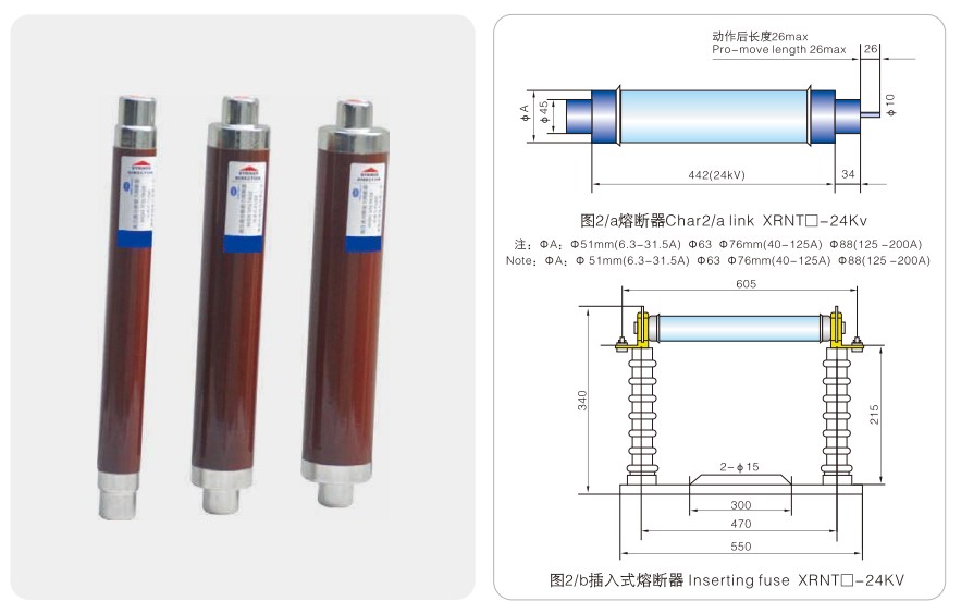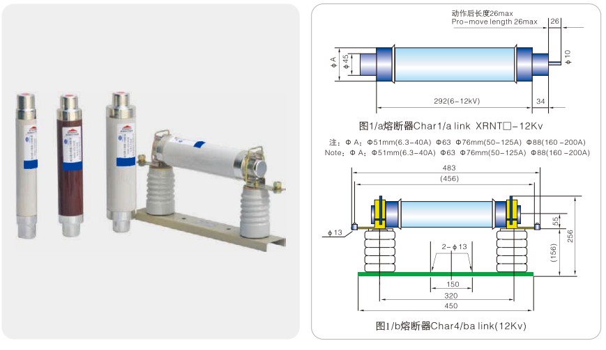 แบบอย่าง พิกัดแรงดันไฟฟ้า Un(kV) ละลายจัดอันดับปัจจุบันใน (A) ขนาดท่อหลอมละลาย①xC(มม.) หมายเหตุ