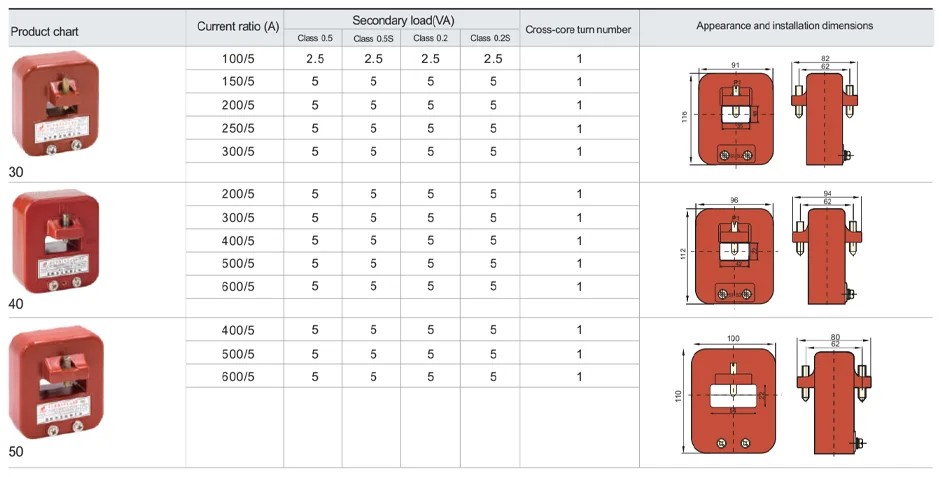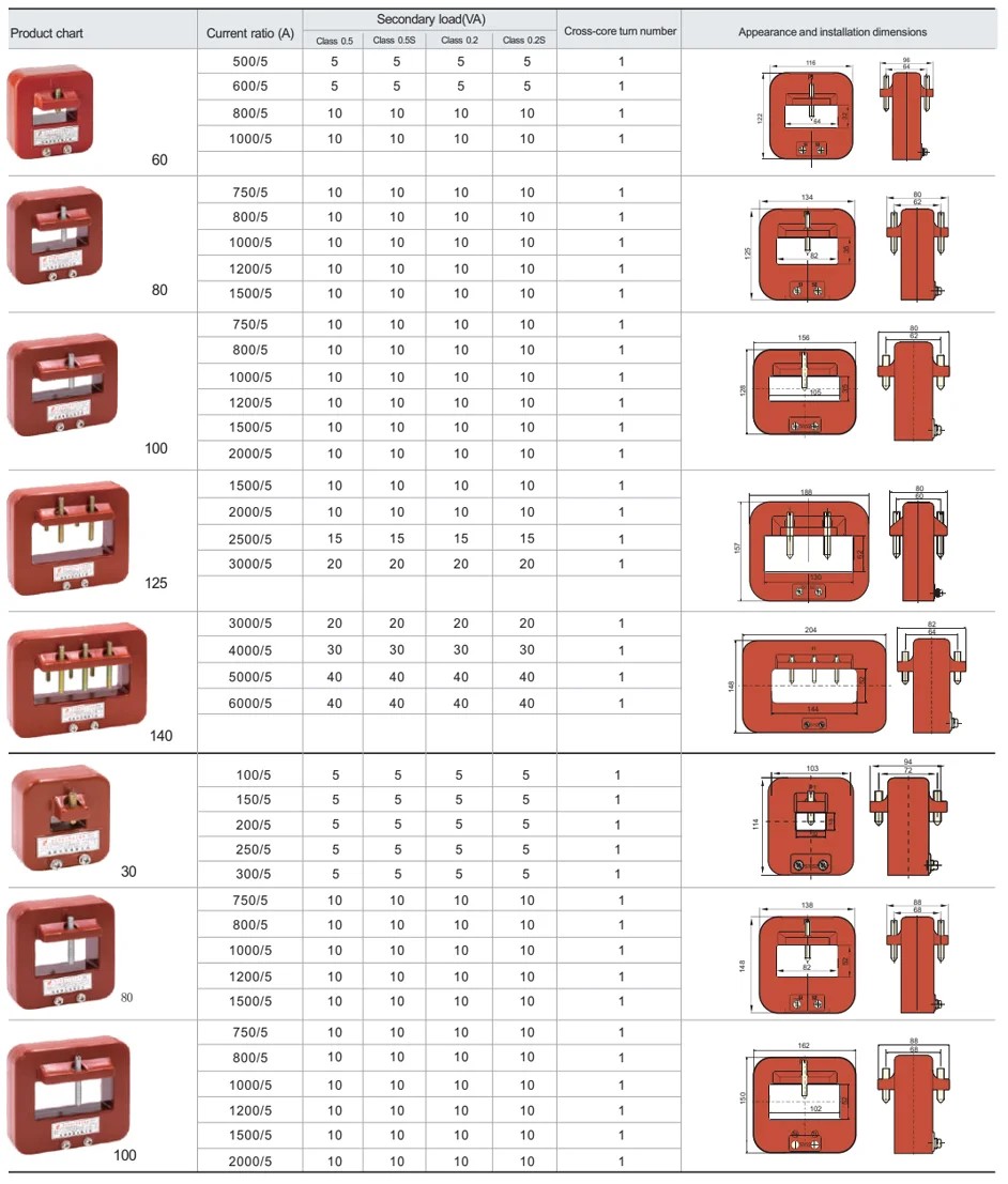 แบบอย่าง อัตราส่วนกระแสไฟที่กำหนด (A) บาร์รถบัส การเลี้ยวผ่านฟีดทรู ระดับที่แม่นยำและพิกัดเอาท์พุต (VA) COSφ = 0.8 ระดับ insulaton จัดอันดับ (kV)